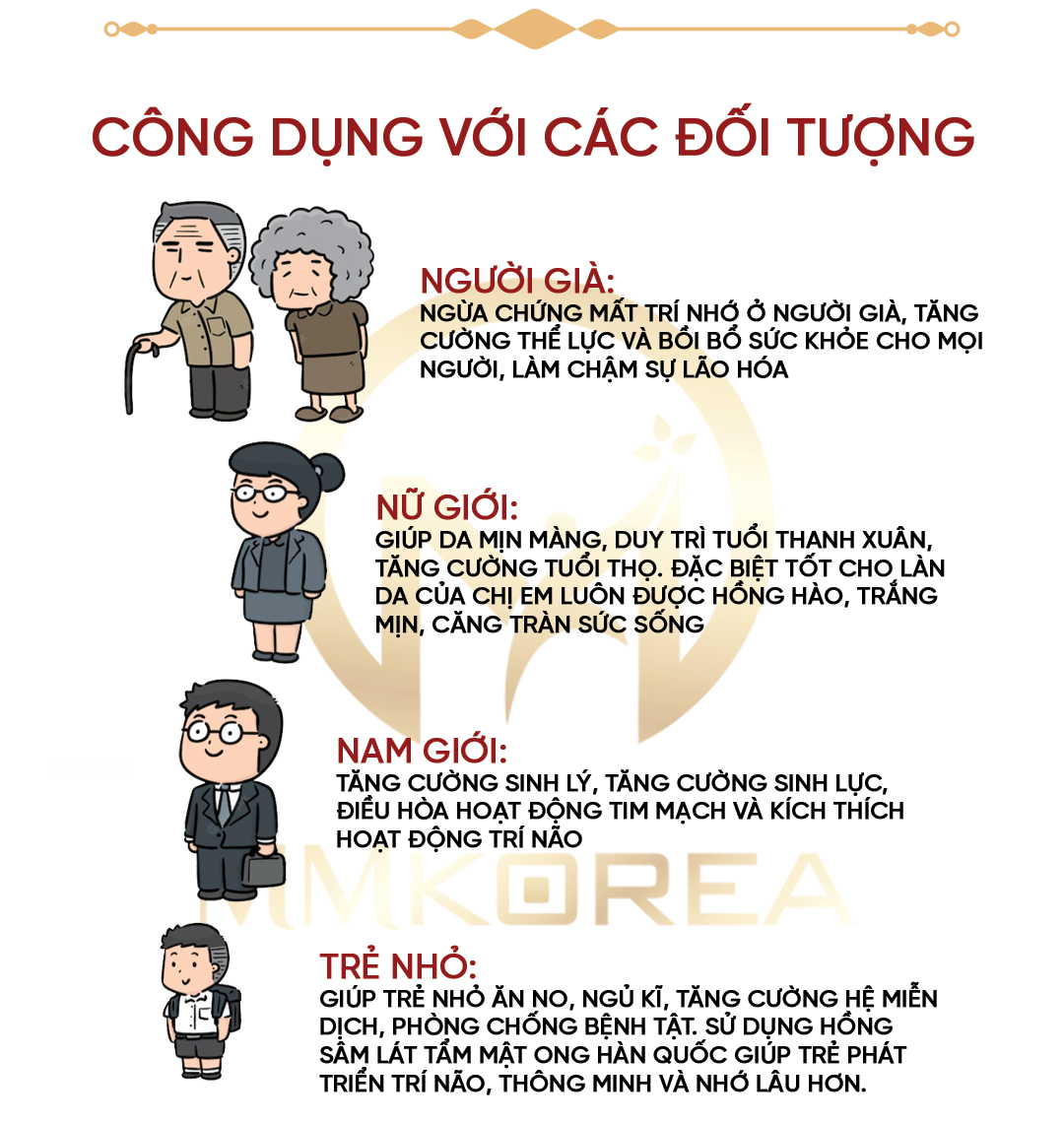 – Hồng sâm nguyên củ tẩm mật ong giúp bồi bổ và tăng cường thể lực ở cơ thể người, ngăn ngừa và làm giảm thiểu rủi ro mắc các bệnh ở cơ thể cũng như hỗ trợ điều trị nhiều bệnh khác nhau như: tiểu đường, xơ vữa động mạch. Bảo vệ gan, giải độc cho gan, nâng cao chức năng gan, thận, viên gan B, C, xơ gan.